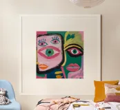 Questo dipinto raffigura due volti con colori vivaci e forme astratte. Lo sfondo è un mix di rosa e verde, che aggiunge un effetto dinamico e intrigante.