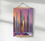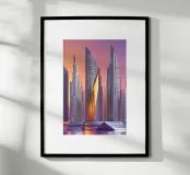 Straordinaria interpretazione dello skyline visionario di Dubai, quest'opera d'arte utilizza l'astrazione per illustrare la perfetta fusione di innovazione ed eleganza. In un cielo sfumato al tramonto, si ergono grattacieli futuristici, le cui strutture sono composte da motivi intricati e lisce finiture metalliche. Il primo piano è caratterizzato da superfici riflettenti frantumate che creano profondità e consistenza, aggiungendo complessità alla scena. La combinazione di toni caldi e linee architettoniche eleganti evoca una qualità onirica, rendendo omaggio al ruolo di Dubai come città dalle possibilità illimitate e dalle ambizioni futuristiche.