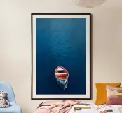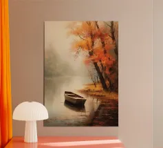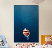 Una barca solitaria galleggia dolcemente sull'acqua calma e blu profondo, la sua quiete riflessiva interrotta solo dalle morbide increspature. Circondata da uno spazio infinito, la barca evoca sentimenti di pace e solitudine, catturati con pennellate morbide e colori ricchi e sereni.
