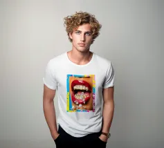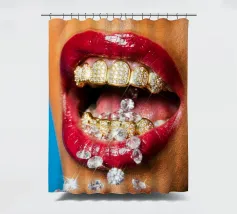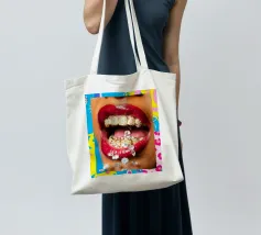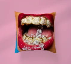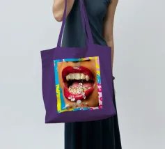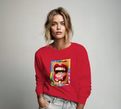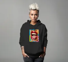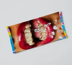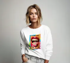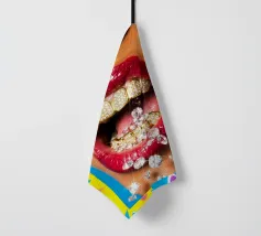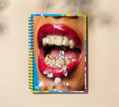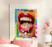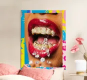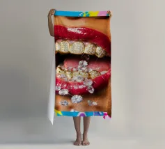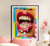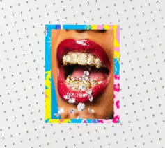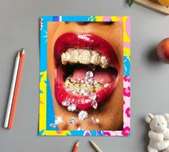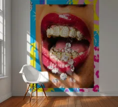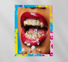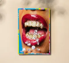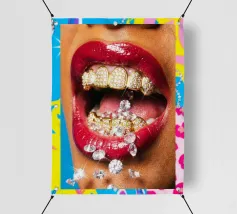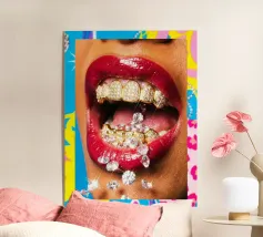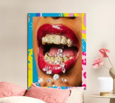 Labbra rosso fuoco, grillz dorati e una pioggia scintillante di diamanti che sembra sgorgare direttamente dalla bocca: questo motivo è puro dramma pop art. Lo sfondo selvaggio in tecnica mista sembra una carta da parati urbana in stile street art e aggiunge ulteriore energia all'insieme. Rumoroso, scintillante e sicuro di sé: una dichiarazione visiva sul glamour, lo status e il desiderio di brillare al massimo. ✨
