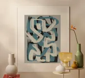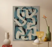 I tratti audaci e intrecciati di blu, bianco e nero creano una composizione astratta su uno sfondo neutro. Le forme sovrapposte e le linee dinamiche trasmettono un senso di movimento ed energia.