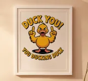 Al centro si trova un'anatra dei cartoni animati, che sfoggia un'espressione di sfida divertente e alza le ali in un gesto non convenzionale. Il testo giallo in grassetto sopra e sotto l'anatra recita un messaggio umoristico.