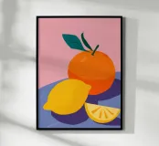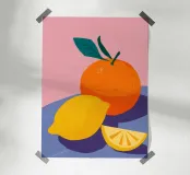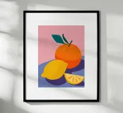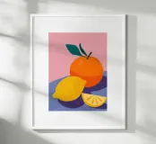 Una natura morta semplice e ben composta di un'arancia intera e di un limone, uno dei quali tagliato, su uno sfondo rosa tenue. L'opera è uno studio minimalista, fresco ed elegante sugli agrumi.