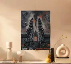 A powerful figure stands in motion, with a temple in the background. Text like 'PRAY' and 'MOVEMENTS' reinforce themes of strength and spirituality.