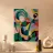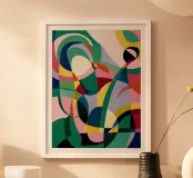 Questa opera d'arte presenta una composizione astratta con colori vivaci e forme fluide. Lo sfondo è un mix di tonalità verdi, rosa e gialle che creano un'opera armoniosa e dinamica.