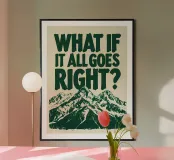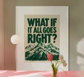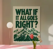 Questa opera d'arte presenta un messaggio di speranza e di ispirazione sovrapposto a una maestosa catena montuosa. Il testo in grassetto, di colore verde scuro, "WHAT IF IT ALL GOES RIGHT?" incoraggia un cambiamento di prospettiva verso l'ottimismo e la possibilità di risultati positivi. Sotto il testo, un'illustrazione dettagliata di montagne innevate evoca un senso di grandezza, resilienza e possibilità di raggiungere grandi altezze. Il contrasto tra la pesante domanda e le cime svettanti invita a riflettere sul superamento delle sfide e a immaginare un futuro di successo.