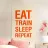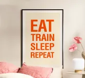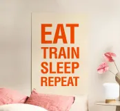 Poster tipografico con le parole "Eat Train Sleep Repeat" in arancione brillante su sfondo chiaro. Ideale per gli appassionati di fitness, gli sportivi o chiunque cerchi una decorazione murale motivazionale e umoristica. Perfetto per la palestra di casa, l'ufficio o la camera da letto. Carattere chiaro e grottesco, design minimalista, umoristico e audace. Stampato su carta opaca di alta qualità - disponibile in vari formati. Il regalo ideale per gli appassionati di sport con stile. Può essere abbinato ad altri disegni typo per una parete dal motivo moderno.