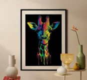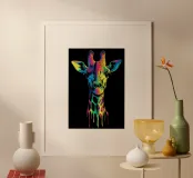 Un ritratto espressivo di una giraffa disegnato con intensi colori al neon e un fluente effetto di fusione. L'illustrazione mostra la testa e il collo dell'animale con transizioni di colori vivaci, dal rosa e dal blu al giallo e al verde. Lo sfondo nero mette in risalto i colori e conferisce al motivo una maggiore profondità. Particolarmente suggestiva è la rappresentazione del collo, che sembra gocciolare verso il basso come un colore liquido. Un'attrazione per le pareti moderne con un tocco di arte urbana.