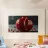 Il melograno appena tagliato poggia su una superficie scura circondata da una poster con telaio in legno
