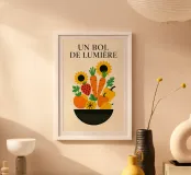Questa versione di "Un Bol de Lumière" presenta un vibrante equilibrio di frutta, verdura e fiori baciati dal sole. Fragole, limoni, peperoni, arance, carote e girasoli si uniscono in una calda armonia grafica. Un'immagine piena di energia, vitamine visive e buon umore. Ideale per ravvivare qualsiasi ambiente con un allegro bagliore vegetale.