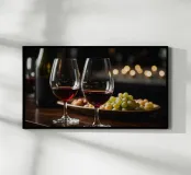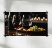 Eleganti bicchieri da vino rosso con uva in un bar accogliente poster con telaio in alluminio