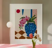 Un quadro raffigurante un vaso blu con fiori rosa su un pavimento a scacchi e una parete a motivi.