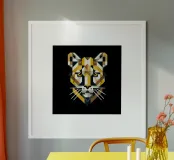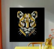 Un maestoso felino rapace, abilmente raffigurato in forme geometriche. Il design moderno con colori decisi e linee chiare cattura la bellezza selvaggia di questo animale. Raffigurazione astratta e geometrica di un grande felino I colori decisi e le linee chiare aggiungono dinamismo all'opera d'arte Simboleggia forza, eleganza e selvatichezza Design moderno con un tocco minimalista Ideale per gli amanti dell'arte che apprezzano gli animali in forma non convenzionale