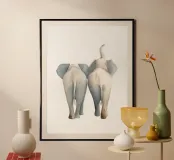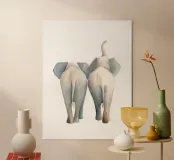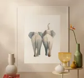 Due elefanti in morbide tonalità beige si mostrano da dietro. Le loro grandi orecchie e proboscidi testimoniano un'amicizia affettuosa che cattura la bellezza della natura africana in questa illustrazione minimalista ad acquerello con sfondo bianco.