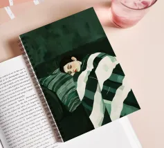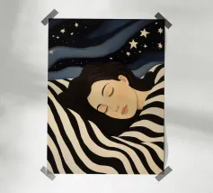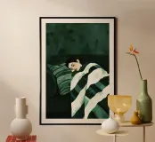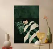 Quest'opera d'arte cattura un momento intimo di riposo attraverso uno stile digitale pittorico e sobrio. Le profonde tonalità smeraldine avvolgono la figura addormentata, creando un bozzolo di calma e protezione. Il morbido contrasto tra il viso pallido e l'ambiente scuro e strutturato enfatizza la vulnerabilità e la pace. Le pennellate stratificate e le forme semplificate sfumano il confine tra corpo e ambiente, suggerendo l'abbandono all'immobilità. La composizione evoca silenzio, calore e rifugio emotivo, trasformando il sonno in un atto tranquillo di introspezione e rinnovamento.