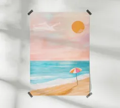 Un'illustrazione serena di una spiaggia tranquilla, immersa in toni caldi. Cappelli da sole appoggiati sulla sabbia e capanne rustiche completano la scena di pace, catturando l'essenza delle lente giornate estive.