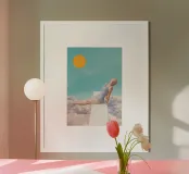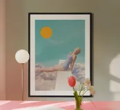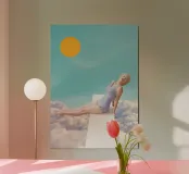 Un collage retrò minimalista che cattura lo spirito spensierato dell'estate. Una donna che si crogiola alla luce del sole sopra le nuvole diventa un simbolo di gioia, libertà e desiderio di giornate calde. La composizione semplice con colori vivaci porta vibrazioni nostalgiche e leggerezza sognante, rendendola un'opera d'arte perfetta per chiunque abbia nostalgia del sole, delle vacanze e delle infinite sensazioni estive.