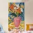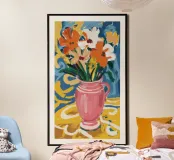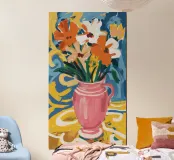 Un dipinto altamente stilizzato ed energico di fiori bianchi e arancioni in un vaso rosa. Lo sfondo è una combinazione dinamica di giallo e blu con motivi vorticosi, che creano un potente senso di movimento.