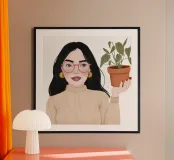 L'opera raffigura una figura che tiene in una mano una pianta in vaso. La figura indossa un maglione beige e lo sfondo è minimalista, sottolineando l'equilibrio tra natura e presenza umana.