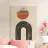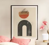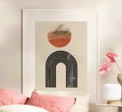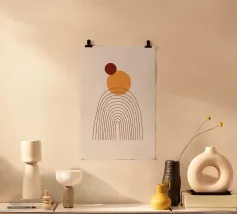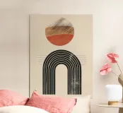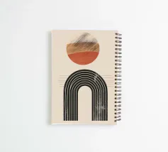 Questo design combina un'armoniosa palette di colori caldi della terra con forme geometriche precise. L'arco curvo nero si integra perfettamente con il cerchio astratto, che presenta una texture legno e un colore rosso ruggine. Una composizione minimalista che irradia calma e stile. Ideale per murales moderni, tessuti o accessori che aggiungono eleganza e personalità a una stanza.