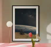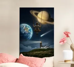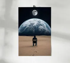 Un collage digitale surreale che mostra una persona sola seduta su una sedia ai confini del mondo, che fissa lo spazio profondo. La Terra si curva sotto di loro, una stella cadente taglia il cielo. Un momento di distacco, di allontanamento dal rumore, dal caos e dalle aspettative, per respirare e osservare l'universo.