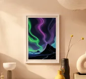 Questo dipinto digitale cattura la bellezza mistica di un crinale di montagna sotto l'ipnotico bagliore dell'aurora boreale. Le vibranti luci verdi e viola si attorcigliano e si trasformano, creando un'atmosfera surreale. Le montagne, avvolte da ombre profonde, sono illuminate da scie luminose celesti. Una rappresentazione davvero accattivante delle meraviglie della natura, perfetta per chi ama l'interazione tra buio e luce nei grandi spazi aperti.