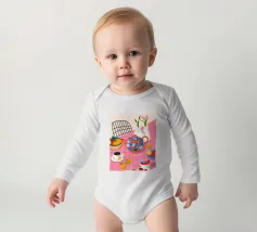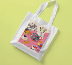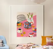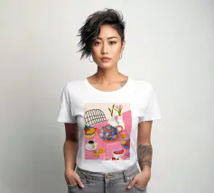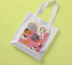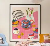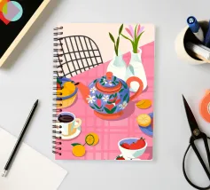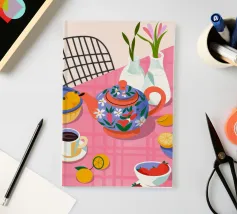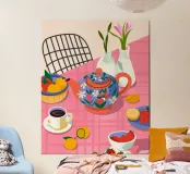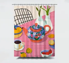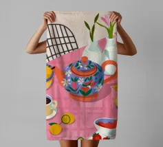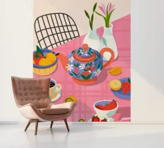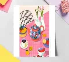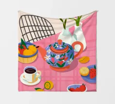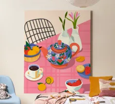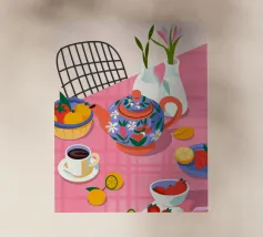 Questa calda composizione illustra un tavolo ornato da una teiera, tazze e frutta assortita. L'estrosa tovaglia rosa e i motivi astratti ne esaltano il fascino invitante.