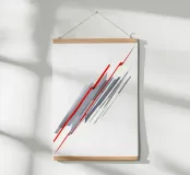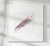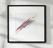 Questo quadro astratto minimalista e dinamico presenta una composizione diagonale di forme geometriche nitide. Segmenti rettangolari bianchi e grigi sovrapposti dominano il centro, creando profondità e movimento, quasi come un simbolo astratto del vento o della velocità. Due linee sottili di colore rosso acceso attraversano questa struttura in scala di grigi, enfatizzando la diagonale e conferendo al quadro un alto livello di energia cinetica. La composizione è precisa, futuristica e isolata su uno sfondo bianco puro.