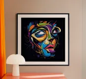 Un dinamico ritratto cubista astratto che mostra colori vivaci, tratti del viso surreali e pennellate audaci su uno sfondo nero. La composizione emana creatività, energia e stile artistico contemporaneo.