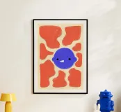 Un volto blu incorniciato da forme astratte arancioni su uno sfondo beige.