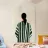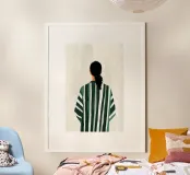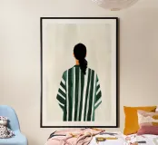 Questa opera d'arte mostra una figura solitaria vista di spalle, vestita con un abito verde a strisce morbide su uno sfondo chiaro e strutturato. La composizione semplice e i colori tenui creano un senso di calma, distanza e riflessione. L'attenzione alla postura piuttosto che all'espressione invita lo spettatore a proiettare i propri pensieri ed emozioni. Un'opera moderna e sobria che porta quiete, equilibrio e presenza silenziosa negli interni contemporanei.