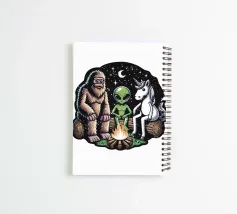 Uno yeti, un alieno e un unicorno sono riuniti intorno a un falò sotto un cielo stellato. Questa scena stravagante combina elementi fantasy e spaziali in un ambiente amichevole.