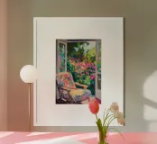 Un dipinto a olio dettagliato mostra una poltrona davanti a una finestra aperta con vista su un rigoglioso giardino fiorito con alberi e arbusti. I fiori risplendono di rosa, viola, giallo e verde. La luce del sole filtra dalla finestra e proietta ombre morbide sulla poltrona, nello stile dell'illustrazione botanica.