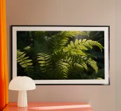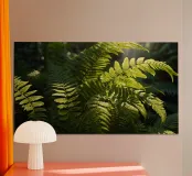 Felci verdi e rigogliose che si crogiolano alla luce del sole in una foresta tranquilla poster con telaio in legno
