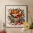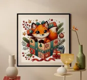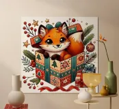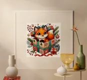 Un'adorabile volpe annidata in una scatola regalo a tema natalizio, circondata da nastri colorati, rametti di pino e bacche rosse. Questa allegra illustrazione cattura la magia delle feste con un fascino accogliente e gioioso, perfetto per chi ama gli animali festosi e le scene invernali.