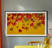 foglie autunnali sparse su uno sfondo giallo caldo poster con telaio in legno