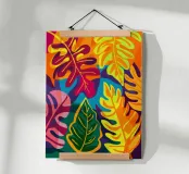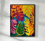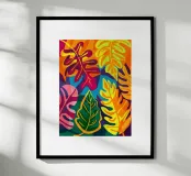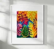Una composizione intensa ed energica di foglie e forme floreali sovradimensionate in una tavolozza infuocata di rosso, arancio e fucsia, contrastata da verdi e blu profondi, che incarna un giardino selvaggio e indomito.