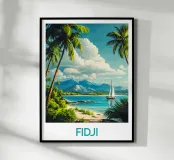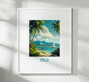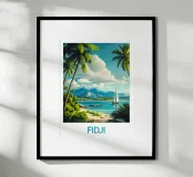 Un'illustrazione paradisiaca delle Isole Fiji, con una spiaggia di sabbia fine, palme lussureggianti e una barca a vela su un mare turchese. Un invito perfetto alla fuga per una decorazione murale rilassante e tropicale.