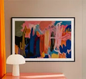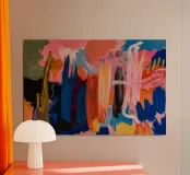 Quest'opera astratta è caratterizzata da segni forti e gestuali in una tavolozza appassionata di arancioni, blu profondi e accenti di rosa, che trasmette energia cruda e movimento.