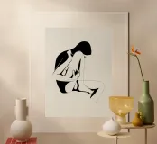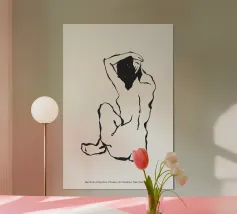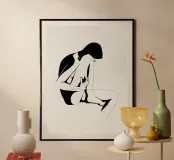 Un'opera d'arte dalle linee minimaliste raffigurante una figura femminile seduta, ripiegata su se stessa in un momento di tranquilla riflessione. Il gioco di forme nere decise e delicate linee di contorno crea intimità e forza, rendendo questo pezzo un'aggiunta sorprendente a qualsiasi interno moderno. Perfetto per gli spazi che abbracciano l'eleganza, la calma e il minimalismo contemporaneo.