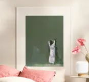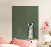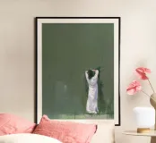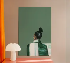 Quest'opera d'arte cattura un momento di pausa: una figura solitaria vestita di bianco, in piedi su uno sfondo verde intenso. La composizione minimale e le pennellate strutturate creano un senso di calma, spazio e concentrazione interiore. Il contrasto tra luce e buio è più radicato che drammatico, rendendo questo pezzo moderno che porta serenità, equilibrio e forza tranquilla negli interni contemporanei.