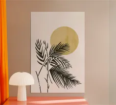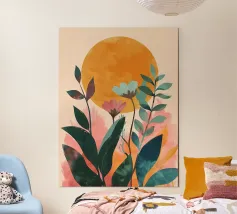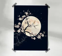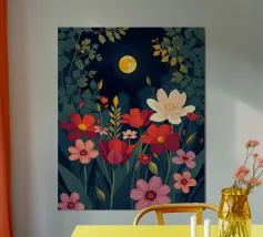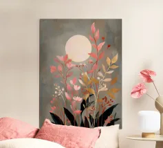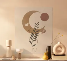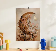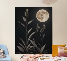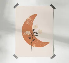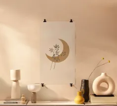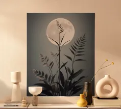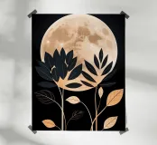 Questa accattivante stampa presenta una luna piena, immersa in un morbido bagliore dorato, su uno sfondo nero profondo. Due eleganti fiori stilizzati, uno con petali scuri e quasi iridescenti e l'altro con delicate foglie dorate, si ergono sotto il globo lunare. Il gioco di luci e ombre, unito agli intricati dettagli degli elementi floreali, crea un pezzo davvero ipnotico che aggiungerà un tocco di bellezza celestiale a qualsiasi spazio.