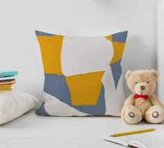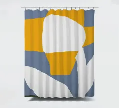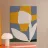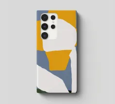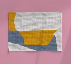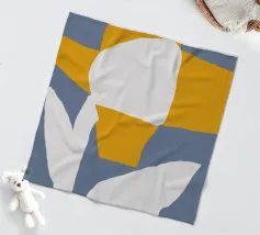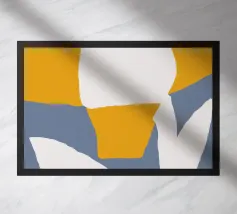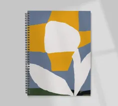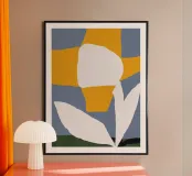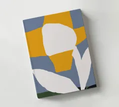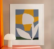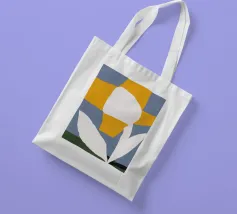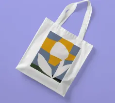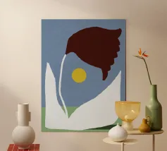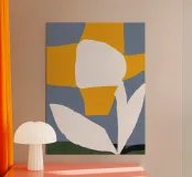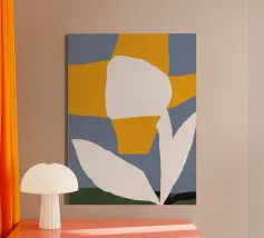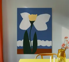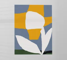 Una rappresentazione minimalista presenta forme astratte che ricordano un fiore bianco su uno sfondo blu e giallo senape. I colori piatti e decisi creano un forte contrasto con la base verde.