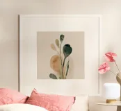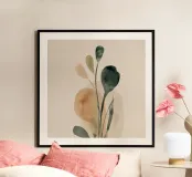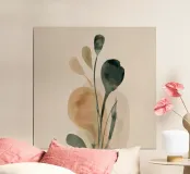 A soft, abstract watercolor composition featuring gentle greens, warm ochres, and translucent taupes. The delicate layering of shapes and stems creates a meditative, organic impression — ideal for minimalist, wabi-sabi, or nature-inspired interiors.