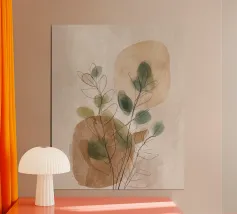 Una composizione astratta e morbida di acquerelli con verdi delicati, ocra caldi e taupi traslucidi. La delicata stratificazione di forme e steli crea un'impressione meditativa e organica, ideale per interni minimalisti, wabi-sabi o ispirati alla natura.