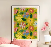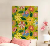 Un allegro disegno di vari fiori stilizzati in colori vivaci come giallo, rosa e blu su uno sfondo verde chiaro. La sensazione è quella di un allegro prato primaverile.