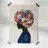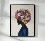 Questa elegante illustrazione mostra una figura femminile con capelli colorati a fiori e labbra viola di profilo laterale. Circondata da un elegante bouquet primaverile, irradia eleganza femminile in armoniose tonalità di rosa, blu e verde.