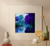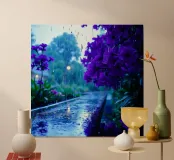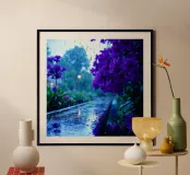 fiori viola circondati da gocce di pioggia, in una tranquilla poster con telaio in legno