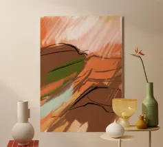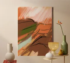 Un'opera astratta ed espressiva che cattura il momento in cui la prima luce si staglia all'orizzonte. Il dipinto è caratterizzato da pennellate vibranti e da una ricca tavolozza di terra di Siena, terracotta e ocra calda, che evoca la potente energia emergente di un nuovo giorno.