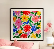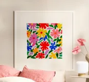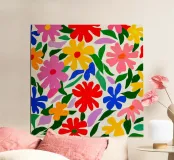 Questo vivace disegno floreale presenta fiori e foglie audaci ed espressivi in un mix giocoso di colori vivaci. Le forme sono semplificate e audaci, con grandi fiori in rosso, giallo, rosa, arancione e blu, completati da foglie verdi e viola. Lo sfondo rimane bianco, permettendo ai colori di risaltare e creare un'atmosfera energica e allegra. Lo stile sciolto e a pennellate evoca un senso di libertà e gioia, rendendo questo disegno ideale per uno spazio moderno e vivace che celebra il colore e la creatività. L'estetica complessiva è fresca, divertente ed edificante.